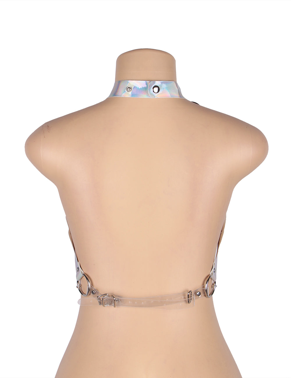 Illuminate your look with the Rain Harness, a dazzling fusion of metallic brilliance and daring design. Crafted from holographic faux leather and adorned with cascading silver chains, this statement piece adds a futuristic edge to any ensemble.